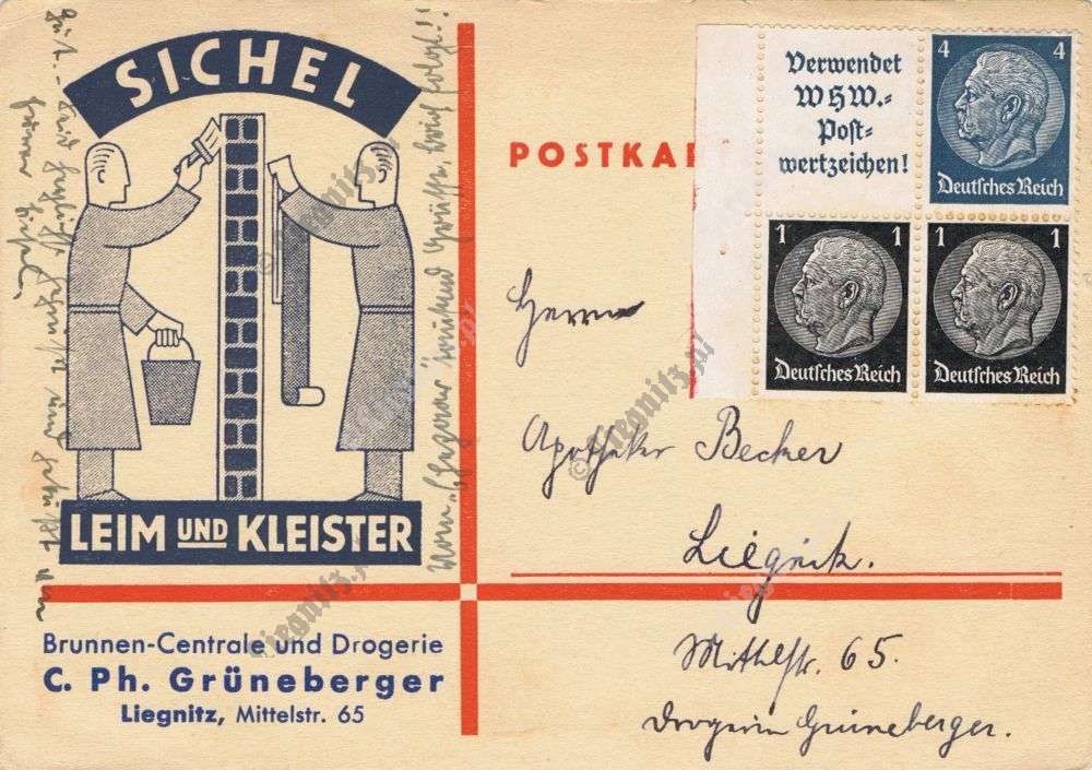 Prezentowana karta pocztowa pochodzi z 1931 r. Przedstawiony został na niej budynek, który ciężko nam zidentyfikować. Na parterze z pewnością znajduje się jeden ze sklepów legnickiej mleczarni (Central Molkerei Liegnitz), która swoją siedzibę miał przy obecnej ul. Zielonej. Adres Grünstraße 3 znajduje się na tyle ciężarówki. Jednak nie wydaje nam się, że jest to ulica Zielona.